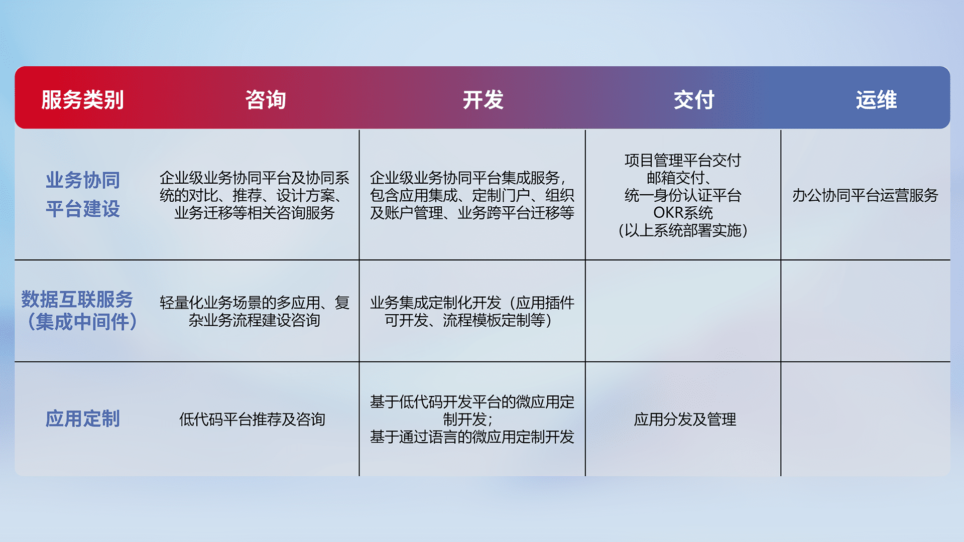 针对钉钉、、、、企微、、、、IDaas等平台级产品提供产品的规划、、方案、、、交付、、、定制化开发等服务,,实现如统一协同办公、、、、智能客户服务、、混合会议管理、、、、智能数据查询、、、等业务场景,,实现数字化转型。。。
